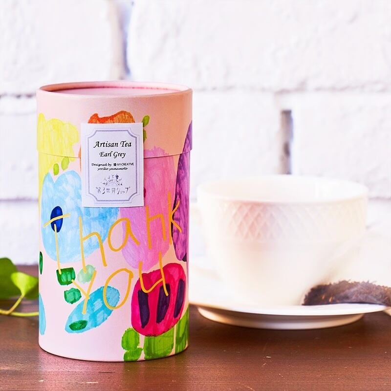 アールグレイ紅茶は、山本 頼子さんの「Thank you」のアートワークがデザインされたパッケージ。